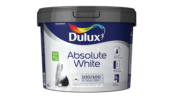 Dulux Absolute White to farba dla Ciebie, jeśli zależy Ci na głęboko matowym wykończeniu w idealnie, absolutnie białym odcieniu bieli (100/100 w skali bieli). Jest bardzo łatwa w aplikacji, a dzięki minimalnemu poziomowi chlapania ogranicza stopień zabrudzeń w pomieszczeniu.