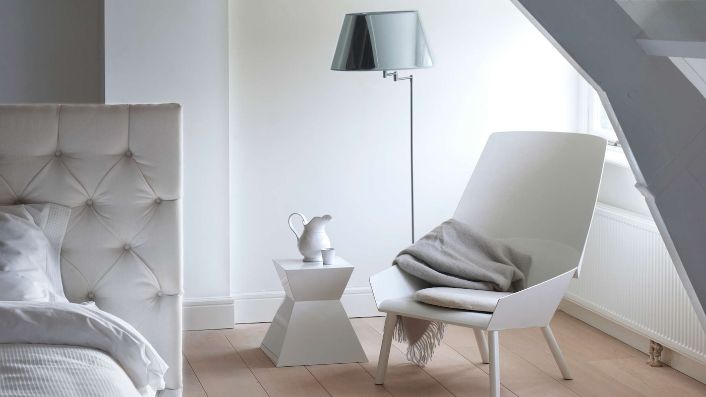 Kolejnym kluczowym elementem aranżacji sypialni ze skosami są kolory. To one nadają wnętrzu danego charakteru, podkreślają walory przestrzeni oraz subtelnie tuszują jej mankamenty. Jeśli borykamy się z niewielkim metrażem, a pomieszczenie na poddaszu wydaje się ciasne i ciemne, zdecydujmy się na jasne, delikatne barwy. Nic tak optycznie nie powiększa wnętrza, jak pochodne, przybrudzone odcienie bieli, błękitu i szarości. Piękny szary Mroźny Poranek z palety Kolorów Świata Dulux perfekcyjnie domknie przestrzeń pod skosami, jednocześnie nie przytłaczając pomieszczenia. Do grona polecanych, nadal stonowanych tonacji można zaliczyć również kremy i beże. Odcienie typu Pustynny Szlak rozjaśnią i dodatkowo ocieplą wnętrze – stanie się ono jeszcze bardziej przytulne.